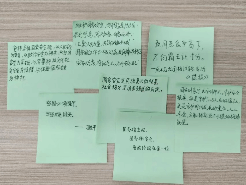 活动设置了富有仪式感的环节——国家安全金句书写。大家在纸上郑重写下自己最喜欢或感触最深的国家安全金句。“强国必须强军,军强才能国安”;“安而不忘危,存而不忘亡,治而不忘乱”。一张薄薄的纸片背后,是一份沉甸甸的承诺,代表着集成电路学子维护国家安全的坚定决心。
