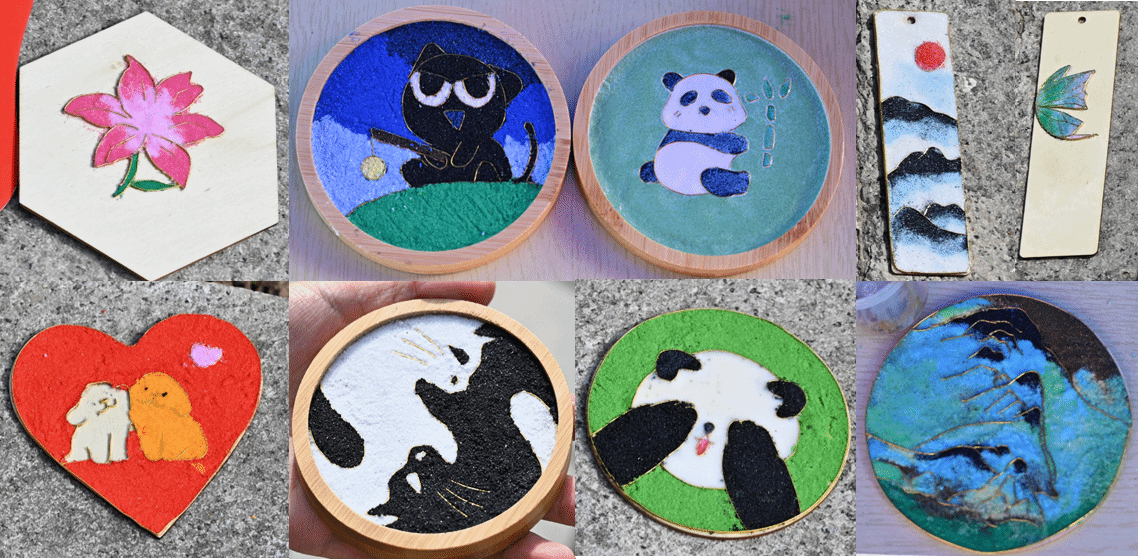 沙画区域内,以沙为墨、以手为笔,铺撒勾勒间,传统纹样与青春创意交融共生,一幅幅作品尽显灵动意境;